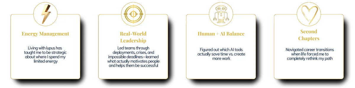 I've spent 20+ years in federal government, military and corporate environments learning how to lead people through impossible situations, then figured out how to build a meaningful life while managing an autoimmune disease that sometimes kicks my butt.